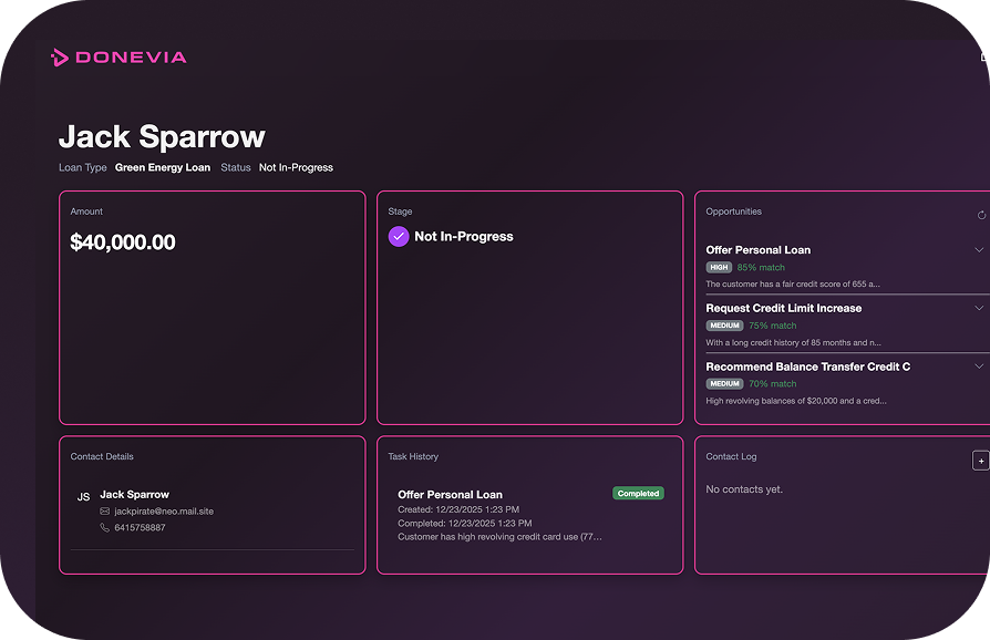 DONEVIA instantly organizes new leads and uses AI to score quality, identify cross-sell potential, and suggest next steps—so your team can act faster and smarter.