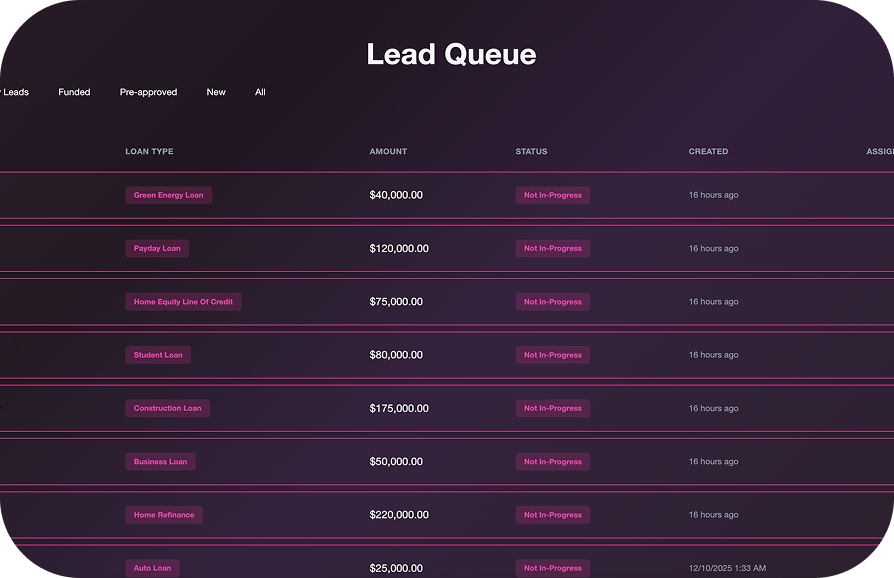 Low friction lead capture, AI credit report analysis for cross sell opportunities, and lead queue for easy assignment.